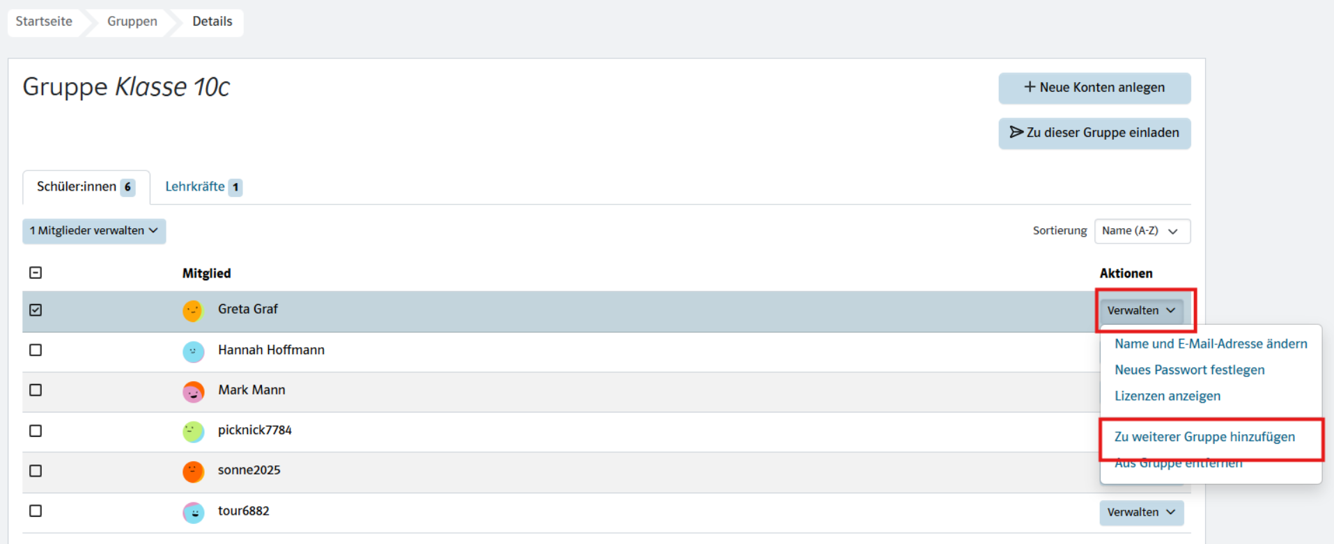 Wenn Sie eine Person (z. B. eine Lehrkraft) zu weiteren Gruppen hinzufügen möchten, gehen Sie wie folgt vor: