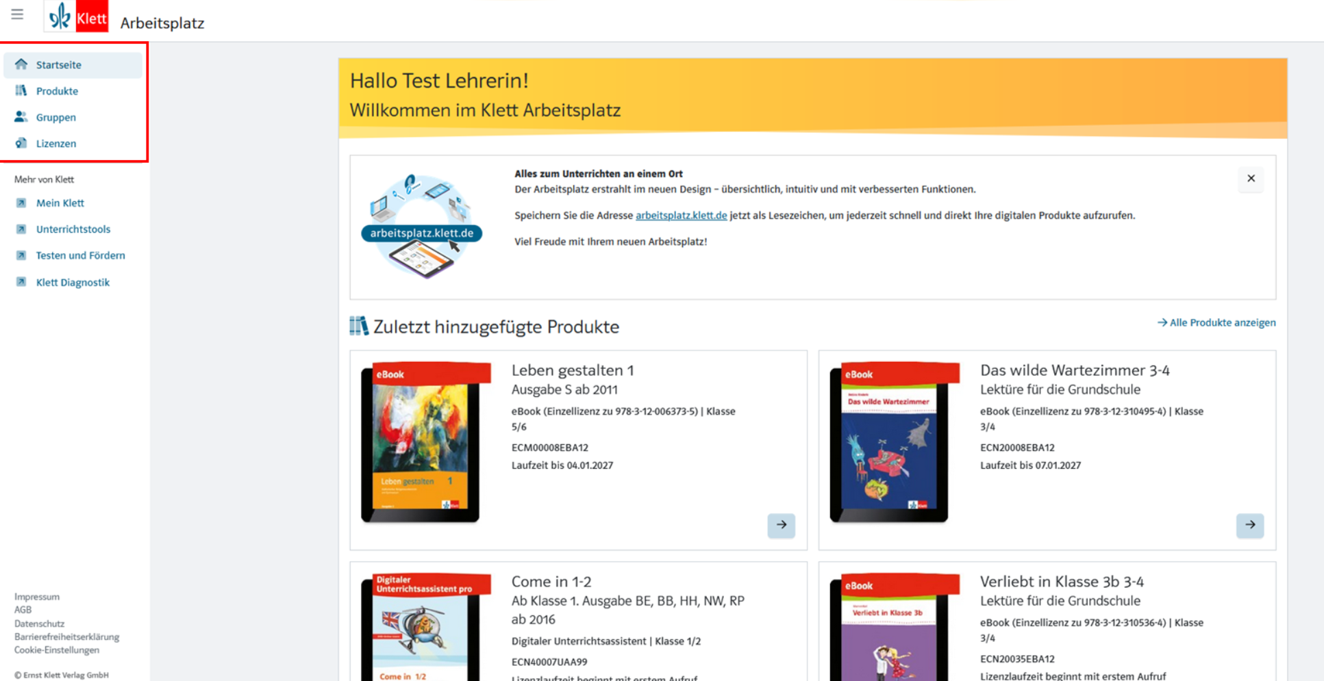 “Startseite”: Auf der Startseite werden die zuletzt hinzugefügten Produkte sowie die zuletzt gekauften Lizenzen angezeigt.