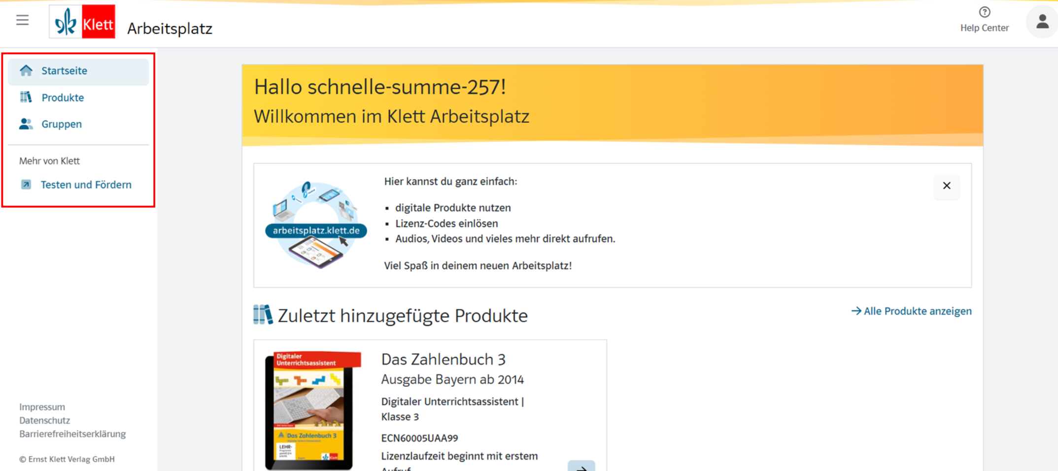"Produkte": Hier können Lizenzcodes / eingelöst und die Produkte aufgerufen werden. In der Klett Lernen App können Produkte auch offline genutzt werden.