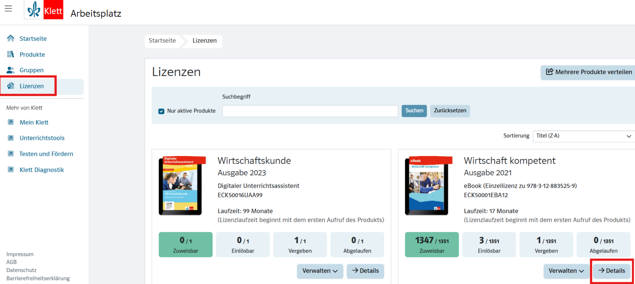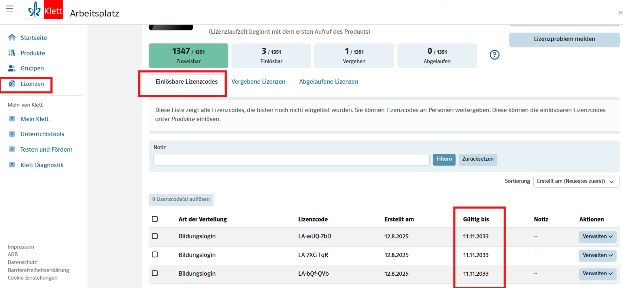 Unsere Lizenzcodes laufen gleichzeitig mit der zu verwaltenden Lizenz ab. Als Lizenzverwalter finden Sie dieses Datum im Tab “Einlösbare Lizenzcodes“ in der Spalte "Gültig bis":