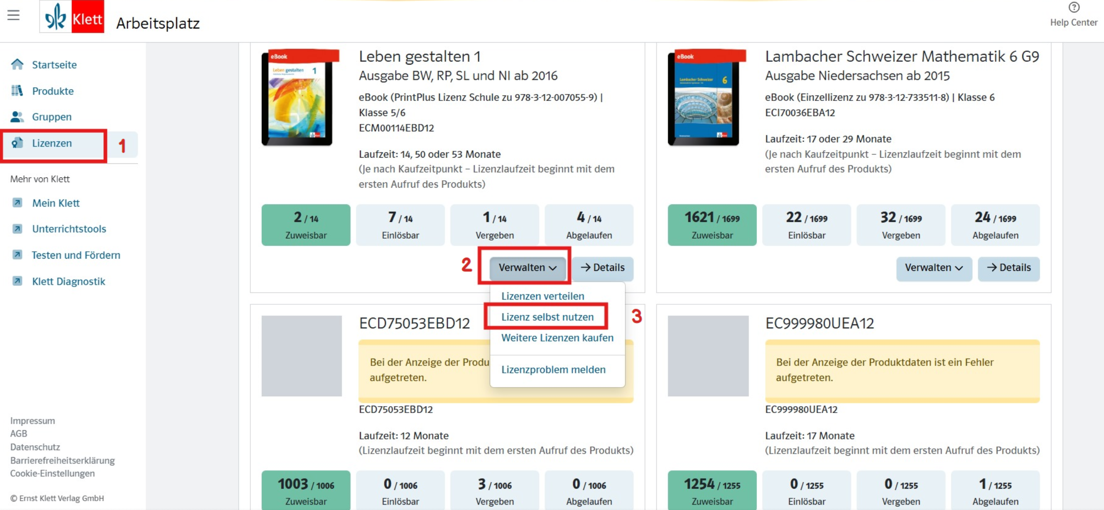 6. Nach der Bestellung erhalten Sie die Lizenz zur Aktivierung. Sie finden die Lizenz in Ihrem Arbeitsplatz im Bereich "Lizenzen". Wenn Sie die Lizenzen selbst einlösen möchten, klicken Sie in der Produkt-Kachel auf das Verwalten Dropdown und wählen “Lizenz selbst nutzen“ aus.