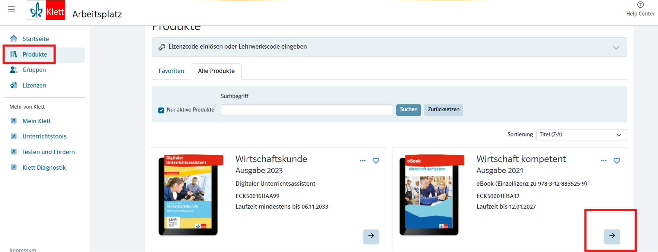 2. Öffnen Sie im Arbeitsplatz unter “Produkte“ das digitale Produkt, mit dem Sie mit Ihrer Schulklasse in der Lernplattform arbeiten möchten.