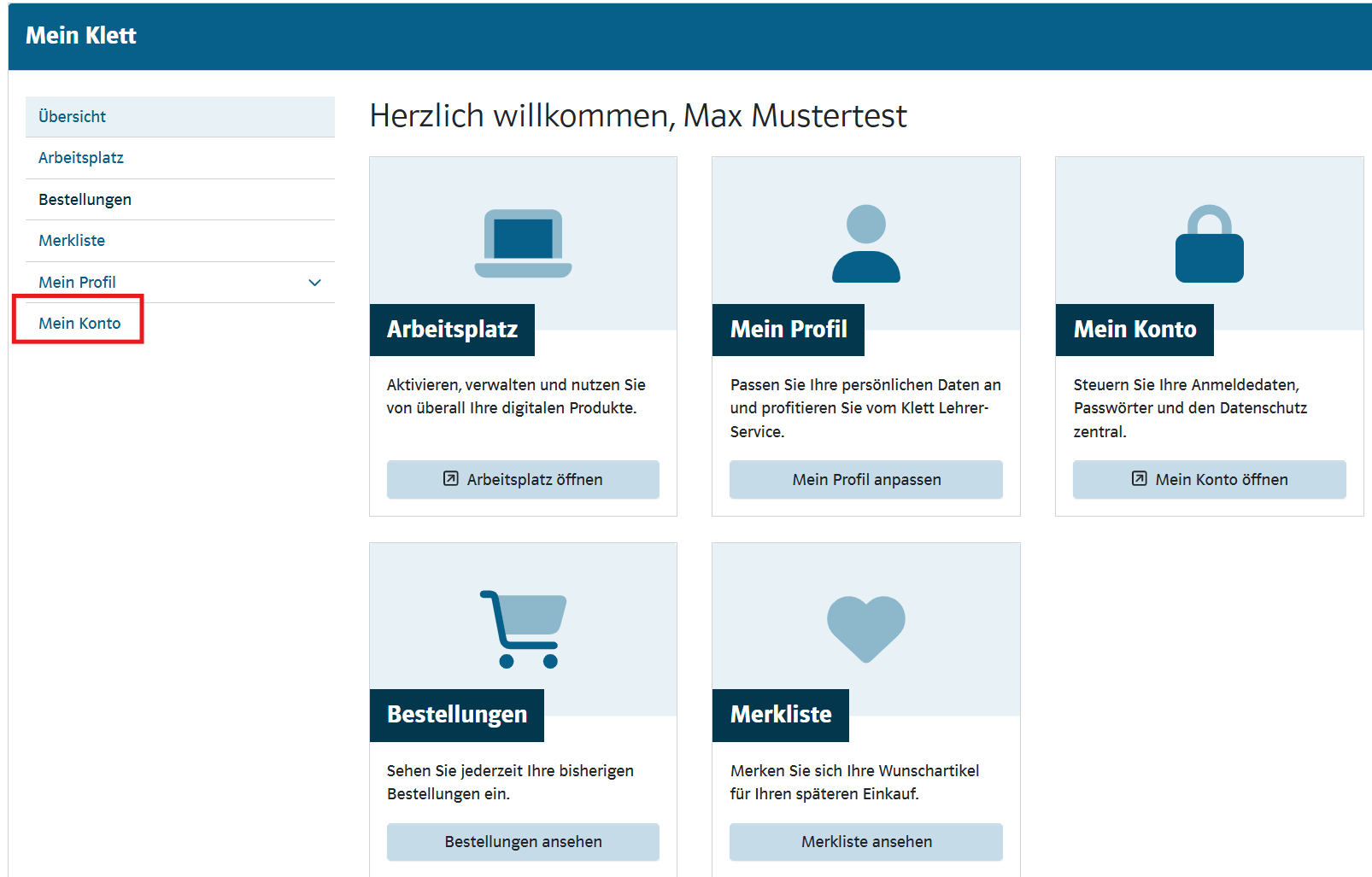 Prüfen Sie dann im Arbeitsplatz unter "Produkte", ob das Produkt dort auftaucht und aufgerufen werden kann. Falls ja, versuchen Sie es im Anschluss nochmals über den Bildungslogin. Falls nein, übermitteln Sie uns bitte einen Screenshot der oben genannten Fehlermeldung sowie die id des Kontos, die Sie unter "Mein Klett" - "Mein Konto" finden: