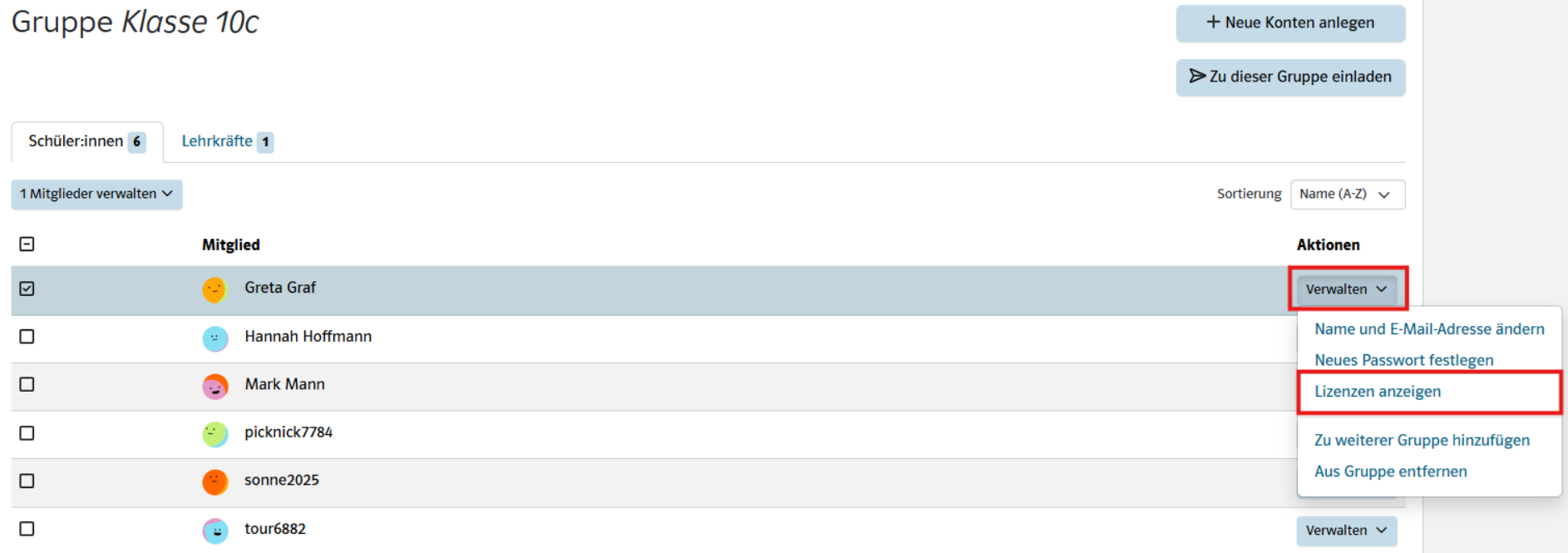 Wie kann ich einsehen, welchem Nutzenden welche Lizenzen zugewiesen sind? Einsehbar über die Gruppenverwaltung über „Gruppen “ bei dem jeweiligen Mitglied über „Verwalten/ Lizenzen anzeigen“. Artikel drucken