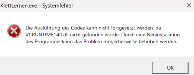 Es handelt sich um ein Problem mit der Microsoft Visual C++ Runtime. Diese wird normalerweise automatisch vom Klett lernen-Setup installiert – allerdings nur, wenn sie noch nicht installiert ist. Auf dem Ihrem System ist möglicherweise die Installation von Visual C++ Runtime beschädigt.