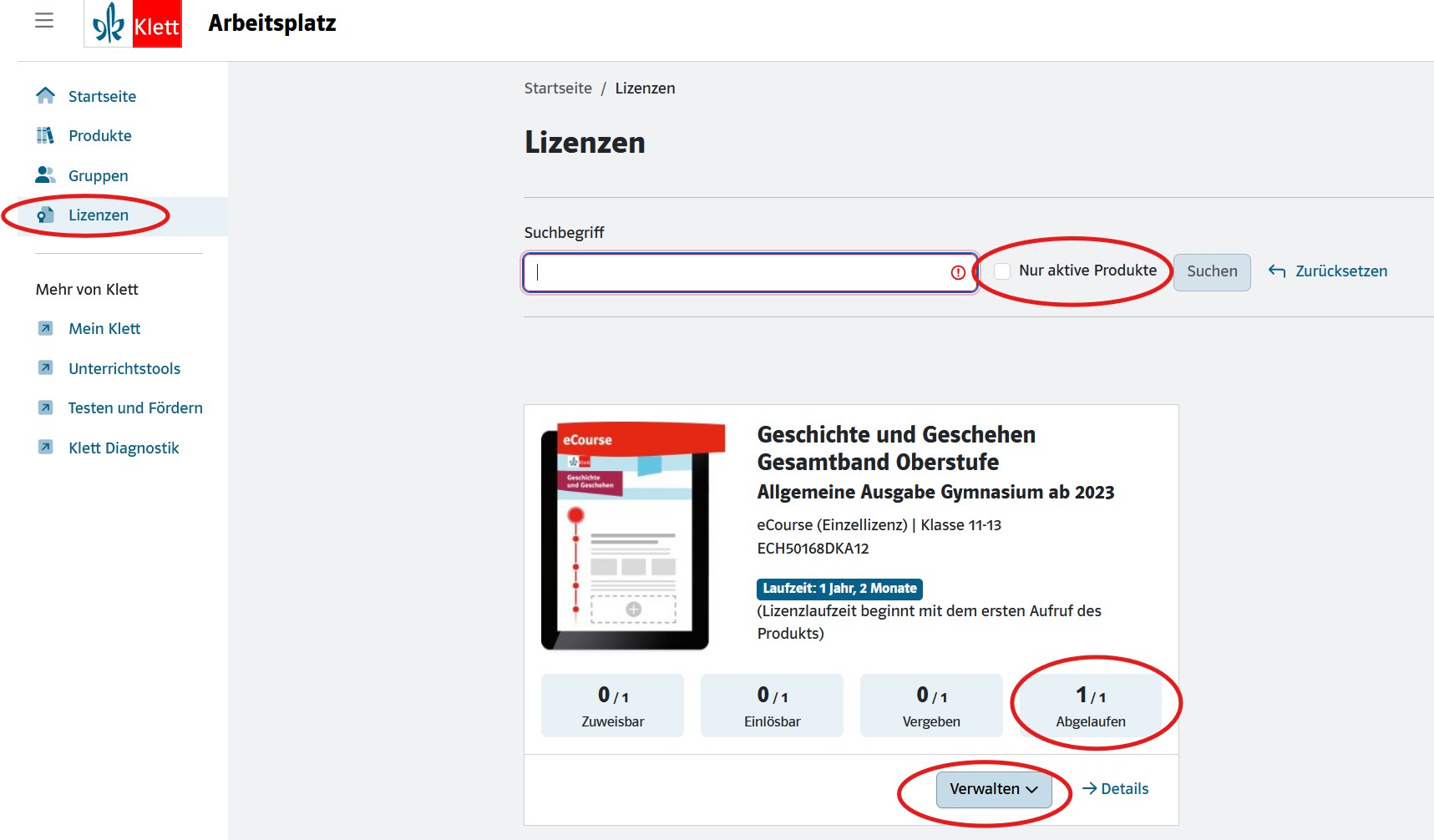 Gehen Sie dazu in Ihrem Arbeitsplatz auf den Menüpunkt "Lizenzen" und entfernen Sie den Haken bei "Nur aktive Produkte".