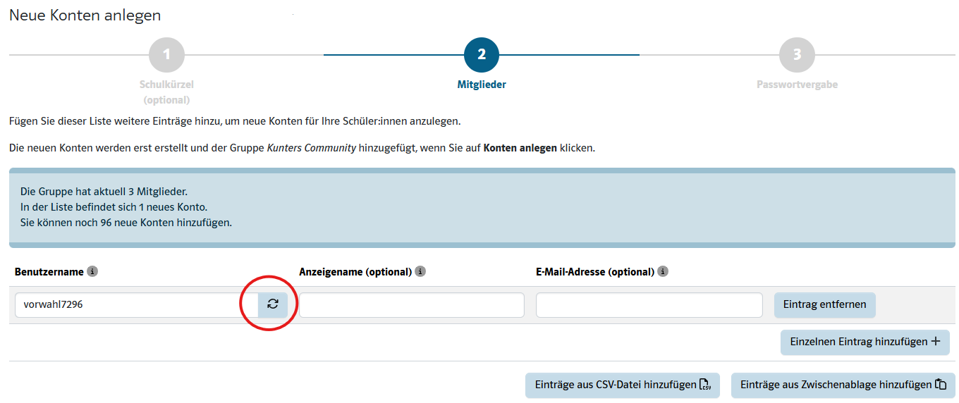 Bei der Erstellung des Kontos kann die Lehrkraft den zufallsgenerierten Benutzernamen ablehnen und einen neuen Vorschlag generieren lassen.