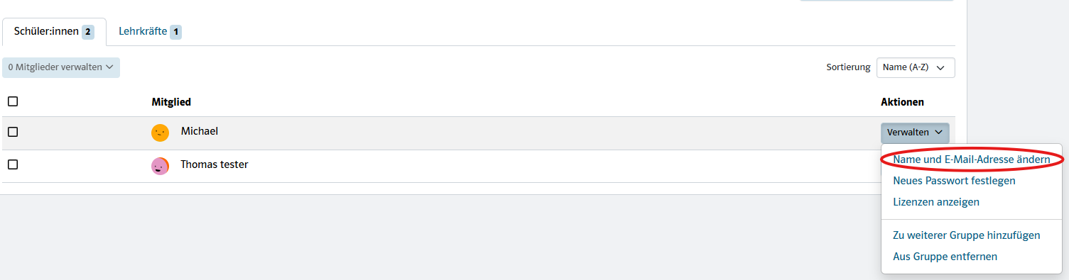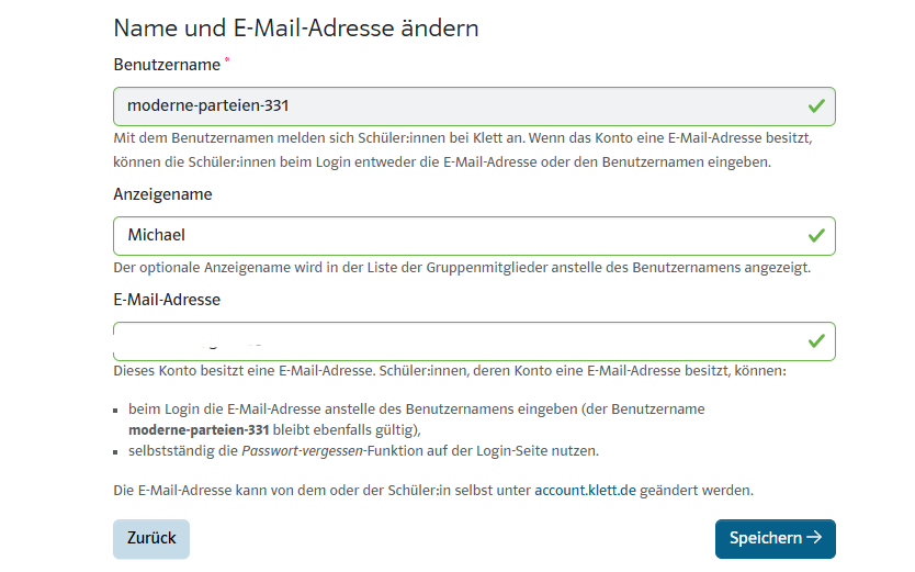 Nachdem das Konto erstellt wurde, ist der Benutzername jedoch festgelegt und nicht mehr editierbar. Lediglich der Anzeigename kann angepasst werden. Der Anzeigename kann ausschließlich von der Lehrkraft eingesehen werden: