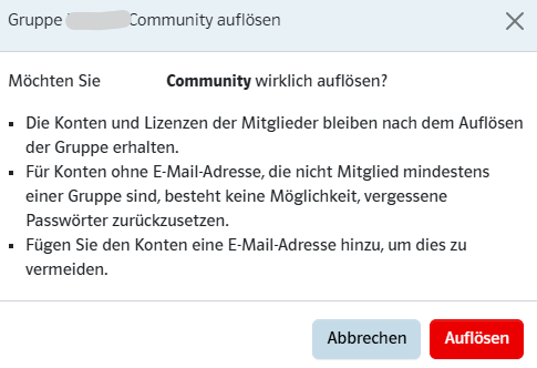 Wenn man auf "Gruppe auflösen" klickt, kommt ein Hinweisbildschirm, der einem erklärt, was passiert, wenn man die Gruppe löscht: