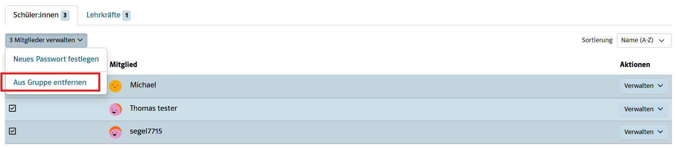 Sie können mehrere Mitglieder gleichzeitig aus einer Gruppe entfernen. Wenn Sie ein Mitglied entfernen, bleibt das Konto selbst und die darin eingelösten Lizenzen weiterhin aktiv, das Mitglied verschwindet lediglich aus der Ihrer Gruppe durch das Entfernen.
