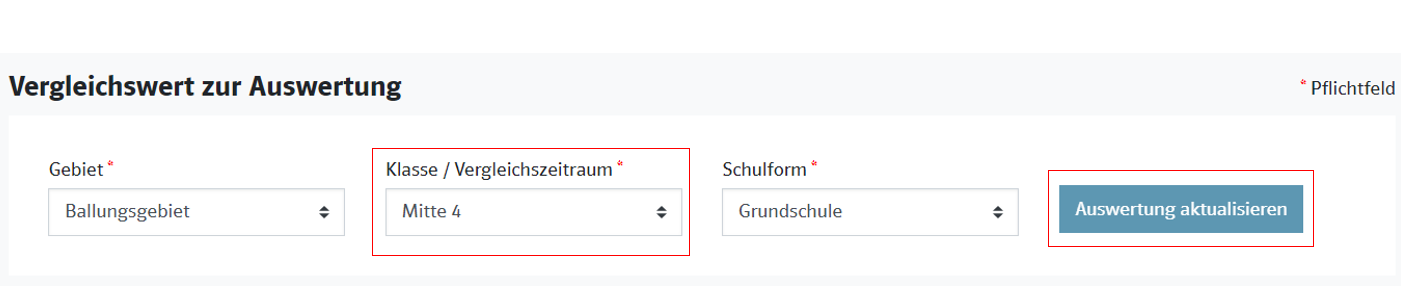 Beim allerersten Abrufen des Ergebnisses wird ein Vergleichswert ausgewählt, damit das Ergebnis berechnet und angezeigt wird. Danach können Sie in der Ansicht „Auswertung“ den Vergleichswert auch nachträglich ändern und das Ergebnis mit dem geänderten Vergleichswert abrufen. Der zuletzt gewählte Vergleichswert wird dann gespeichert.
